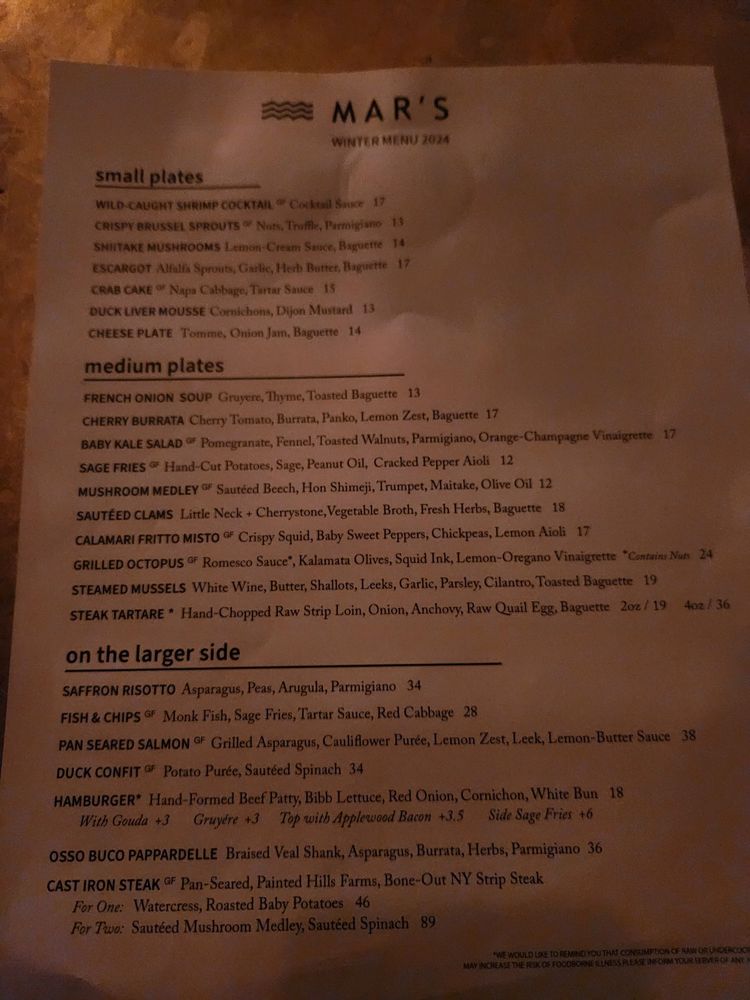 Step into the intimate and romantic ambiance of Mar's, a New American Seafood haven located at 34-21 34th Ave, Astoria, NY. This gem offers everything from raw bar delicacies like Kumamoto and Malpeque oysters to small plates bursting with flavor, like crispy Brussel sprouts and smoked trout mousse. The Winter Oyster Sampler and WildCaught Shrimp Cocktail are must-try favorites among patrons. The extensive menu also features dishes like escargot, pâté de campagne, and charred romaine, all served with a touch of elegance. Customers rave about the delicious cocktails and exceptional service, making Mar's the perfect spot for a cozy date night or gathering with friends. With options like covered outdoor seating, full bar, and even pool table access, Mar's offers a unique dining experience with a touch of sophistication. Experience the best nights at Mar's on Wednesday, Thursday, and Friday, and indulge in a culinary journey unlike any other.